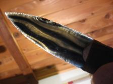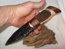 What a nice, unique knife. It is 10 inches long and this very nice dagger or paleo blade has been knapped out of a cloudy ribbon Obsidian with just a little spot of red. This handle is a thicker Elk antler piece with a nice walnut end cap. This is such beautiful knife for the flint knapping collection or to resell at a pow wow or rendezvous. The blade has been hafted to the antler handle with resins and artificial sinews. This piece does come with a certificate of Authenticity. It will have a picture or your knife and a brief description and will be signed and dated by the Artist.