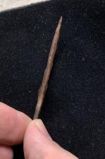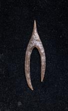 This hollow base point was styled after points discovered in Spain. Very challenging to knap with long delicate ears and needle sharp tip. This point is made from a piece of root beer from Texas. |