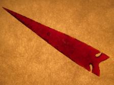 These seem to be in demand of late so here's another one. This is a ruby red or cranberry glass. Interestingly, this point has a bubble in it just above the half way mark towards the tip. I didn't plan it that way, was just sort of a happy accident. The bubble shows up in the second back lit photo. Needle tip and sleek curving narrow Wintu style expanding notches and base adorn this piece. |