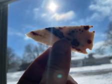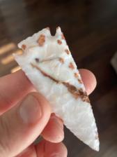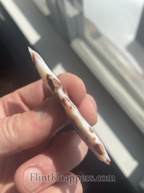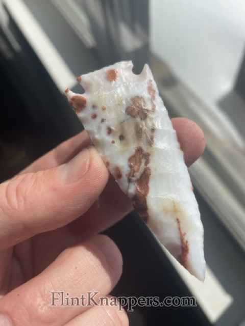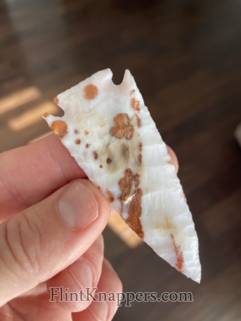 This point was knapped from a piece of luminous milky white Polka Dot chert and is naturally adorned with vivid iron splotches.