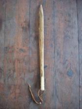 26 in. long and made from a solid piece of beautiful black locust, this thrower is quiet elegance and understated power. a molded grip and smoke tan wrist thong give it stability and security while the thin flexible body delivers a super smooth cast. one of a kind, it is a steal at this price! |