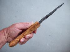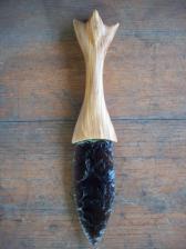 13'' overall. made from banded obsidian with a carved olive wood handle.