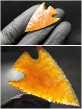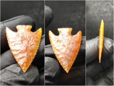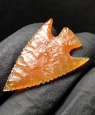 Nice and lean Scallorn point in vibrant orange Carnelian from Brazil. Flake scars have a rippled appearance, especially on the B side, but it came out smooth and regular anyway. If that makes sense.