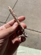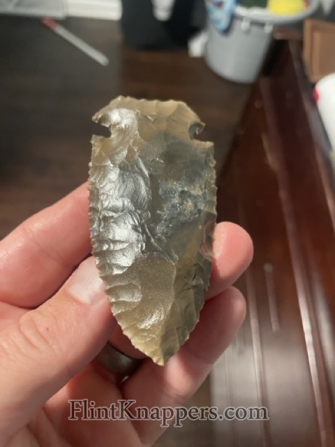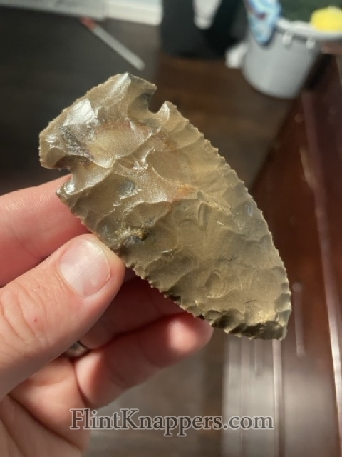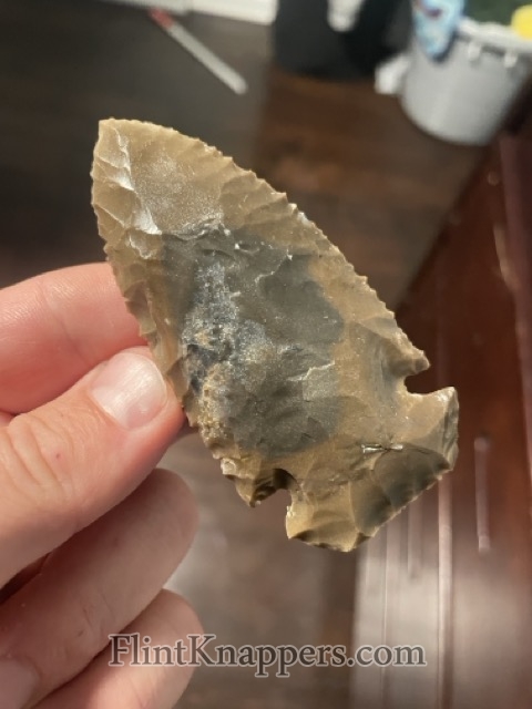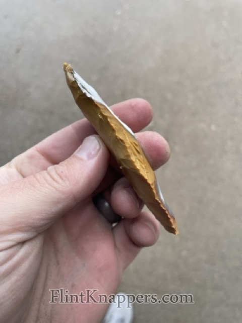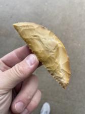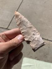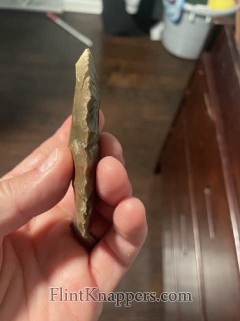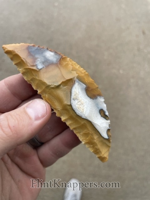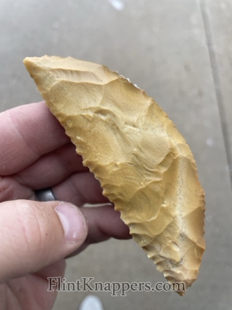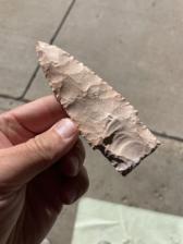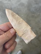 A Scottsbluff style blade. Material is a fossiliferious variety of Burlington. Nice crystal seam on one face too.