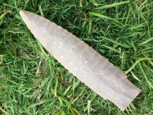 A really nice Scottsbluff by master flint knapper, Bob Thomas. The Scottsbluff is tan and made out of Pedernales from the Texas Hill Country. Very nice workmanship. From the Elby Short Collection, Springdale, Arkansas. Knapped in the 1980's. Inv # 9905-91R |