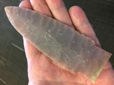 A nice Jeff Gower Scottsbluff out of Texas Pedernales. The point is a mauve purple with light tan on the base. Jeff is one of the best commercial flint knappers in the U.S. Knapped Mar, 1999 |