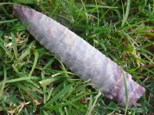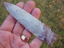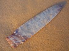 Christmas Special! A nice Scottsbluff by one of the early abo knappers and master at flint knapping, Jim Spears. This piece was made from raw Texas Alibates. The colors are gray and purplish red. Knapped Sept, 2000. |