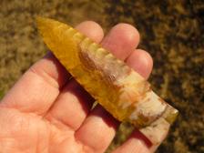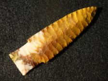 A really colorful Scottsbluff out of Oregon Sunset Jasper. This Scottsbluff is tan, red, and cream. It was knapped by master flint knapper, Steve Behrnes. Knapped Aug, 2002. Signed: SB 02 |