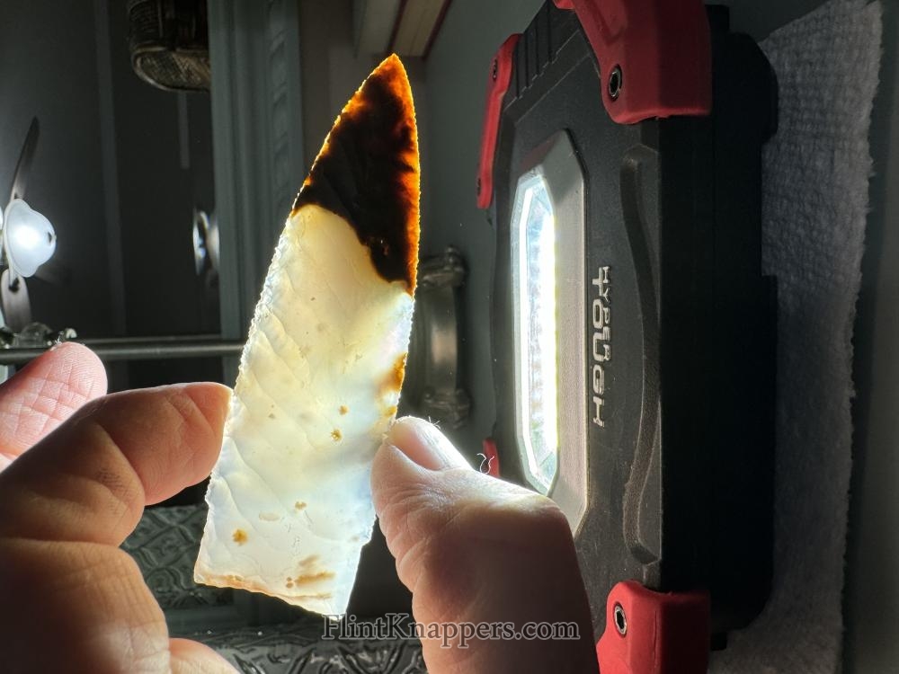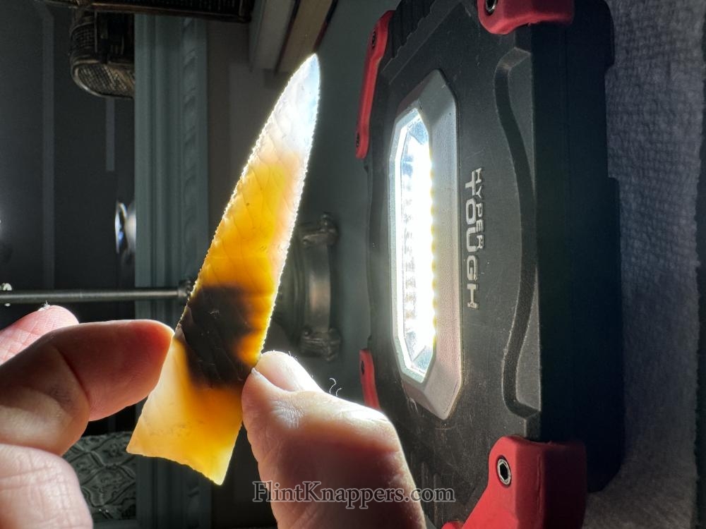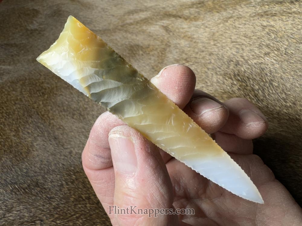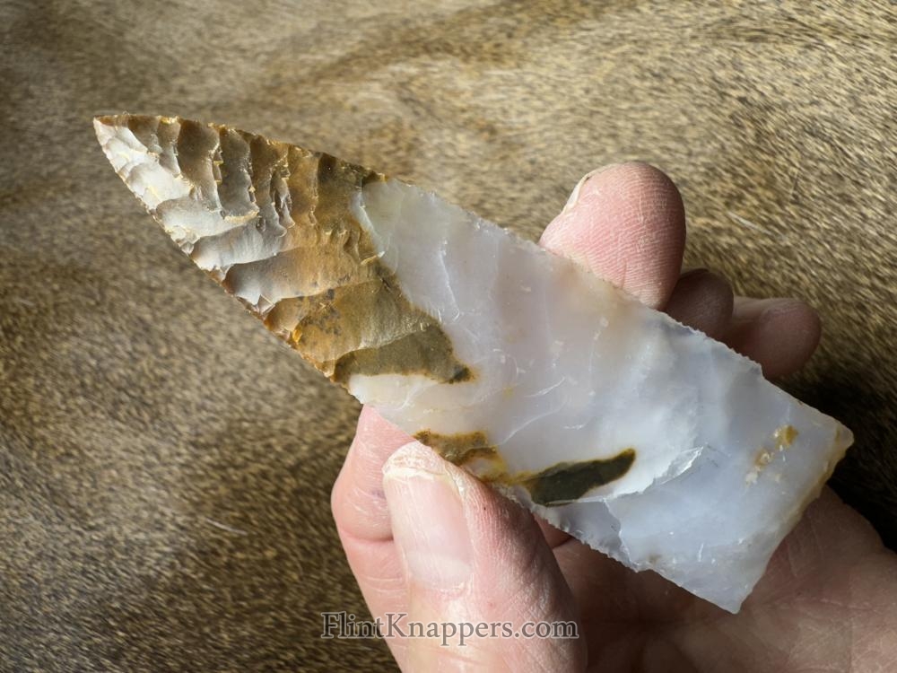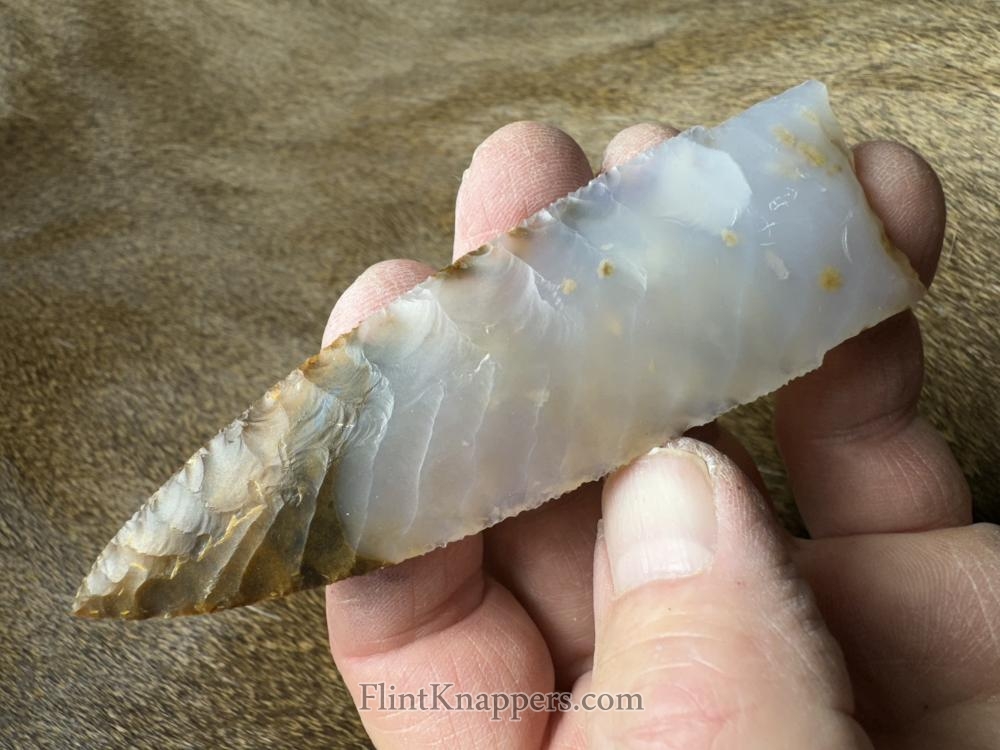 Made from beautiful Polkadot agate from Oregon! Serrated sharp with a nice chevron flaking pattern! Hafting area is ground, thanks for looking! |