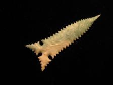 This nice Cahokia point is the Mound 72 variety and fully serrated with expanding notches. Its made from flint ridge and is about half cream white and half bluish green. I don't make too many of these. |