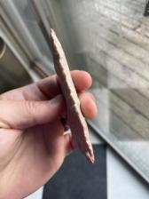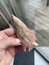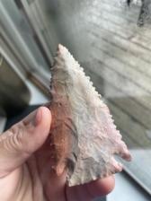 A serrated corner notch. This point was made using an incredibly colorful heat-treated Burlington biface. A very thin percussioned piece!