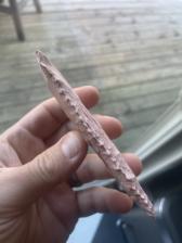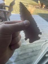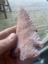 A serrated, heat-treated Burlington corner-notch arrowhead. This point has a bevel started.