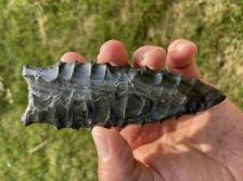 Big serrated Dalton made from glossy silver sheen obsidian. Wicked serrations on this piece! Hafting area is ground. Thanks for looking! |