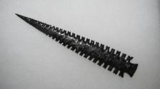 This obsidian Stockton point is made out of an unusual obsidian out of Nevada with grayish green spotting and gray swirls in it. Some of this stuff looks like the famous Burns green obsidian. This Stockton has its square serrated edges serrated. Making one of these things is like defusing a bomb....I don't make very many. |