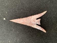 This Gunter style point is made from a self collected material from central Wyoming that I call “dinosaur bone†because of it’s bone marrow appearance. It is likely a variation of phosphoria. The point well made with nice serration. |