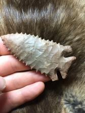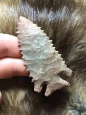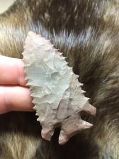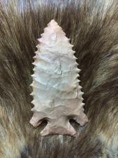 Pine Tree Point made of heat treated Buffalo River chert. It is highly serrated, but otherwise made like the originals. I really like Buffalo River chert and it's many patterns. |
