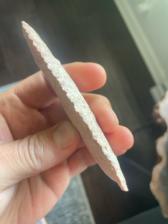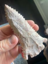 A serrated, heat-treated Burlington Stillwell arrowhead. This variety of Burlington is a fossiliferious red/white. This point has a slight bevel.