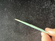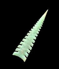 This point is made from a green dyed agate. It’s a very colorful and unique material. The serrations are styled after a Stockton point however the base is a side notch. |