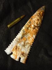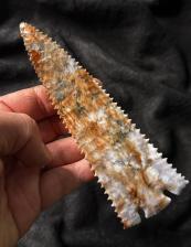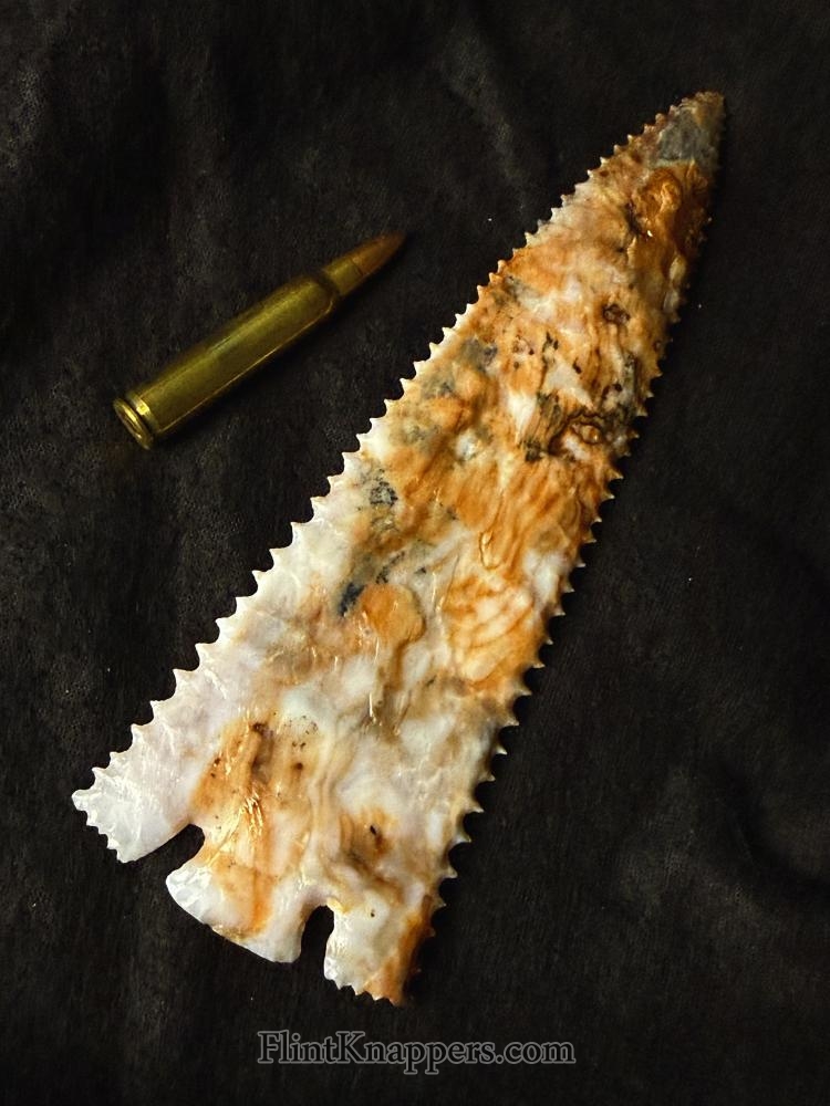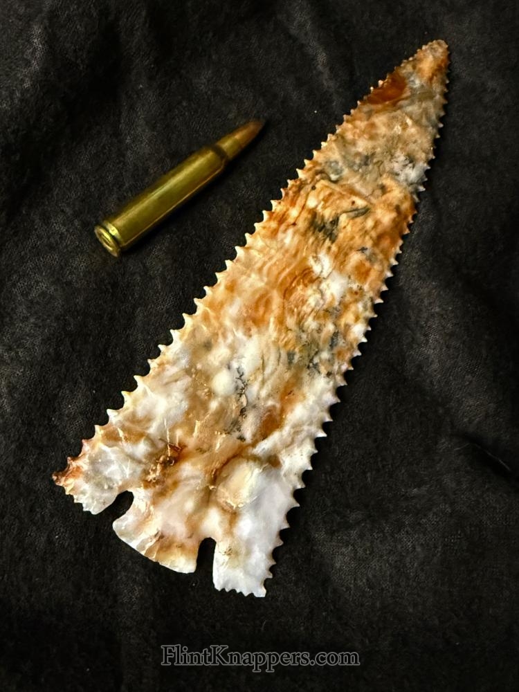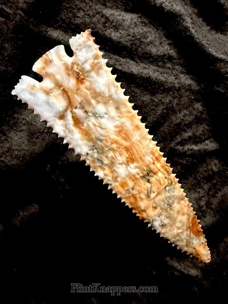 This Snake River Pinetree is full of colors, swirls, and patterns. It is a large spear point with great serrations. It’s a really nice point. |