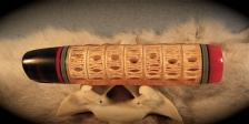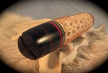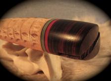 This is one of the nicest knife handles to come out of my shop! Anchoring the piece is a gorgeous section of shark vertebra. (It’s hard & heavy – and makes a great textured grip. Between it’s own natural sinew & my dunking it in CA glue…it is darn near indestructible). Epoxied & pinned to this are matching colored spacers & an antique bakelite butt cap in a 3-D red swirl. The front guard is fashioned from a choice piece of Central American Cocobolo wood. All is sanded & finished to perfection. Save your choicest knife blade this guy! Please add $7.00 to ship & insure anywhere in the U.S. -- Thanx for looking & God Bless! |