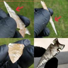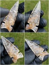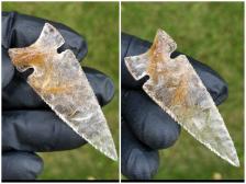 Sweet Side Notch in rare Rutilated Crystal Quartz. This piece shows an especially nice group of Rutile Needles inside. If it wasn't for a diving flake that took a chip off the center of one face, I'd be asking a lot more for this one, because the cost of the material is outrageous in my opinion. Everything else about the point came out well, and I've pointed out in the last set of pics where the chip is, so you can determine if it's something that would bother you or not.