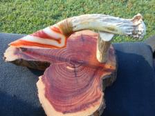 This knife has a antler handle with a brazilian agate blade and comes with a cedar wood and antler stand. |