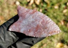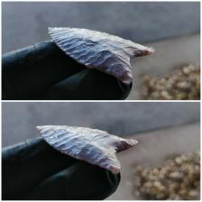 Excellent Dalton in Indian Red Moss Agate. Super flaking and overall reproduction of a small form Dalton. Don't see knappers making the smaller forms often but I'm definitely a fan of them. Very happy with this point. In a great piece of Indian Red Moss Agate, with awesome features , very smooth and glossy. The blue chalcedony, with the red moss create a striking purple coloration when viewed from a distance, would make a nice addition to any Dalton collection, or point collection in general.