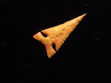 This cute little serrated Wintu style point is made out of a percussion flake of colorful sunset jasper I had on hand. Most real Wintu points were more of this size. Deep curved notches and serrated edges made these sharp little arrow points lethal. |