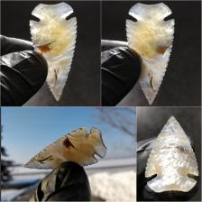 Super cool Bifurcated Corner Notch in Smoky and Dendritic Brazilian Agate. Killer edge work, Clean flaking, good balance, regular and smooth surface, but the scar pattern is a bit disorganized in some areas. I really like the coloration, bands, and dendrites in this piece.