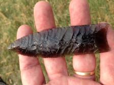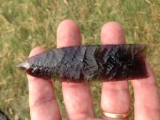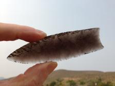A paleo-style spear point, knapped by percussion and pressure from hand-dug eastern Oregon rock. The stone is translucent, smoky obsidian. The edges on the lower sides and base have been ground smooth to facilitate hafting and wrapping. |