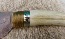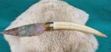 This handsome knife employs the use of a deer antler tine that I have sanded & polished down to white, to where it almost looks like an ivory tusk or tooth! I have knapped a beautiful piece of agate stone of burgundy, green & pink, & hafted this to the handle. A laser-cut stainless steel “snake” band, artfully adds strength to the joint & uniqueness to the knife. All this has been married to a suede & tassled leather belt sheath – adorned with an antique copper “owl” concho. Rustic elegance!!! The knife is 10 3/4” long. (Please add an additional $9.00 for shipping & insurance to anywhere in the U.S. only). Thanx for looking! **NOTICE: WHILE SHARP & BUILT TO LAST….MY CREATIONS ARE FOR COLLECTING PURPOSES & NOT FOR HARD USE! |