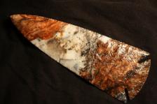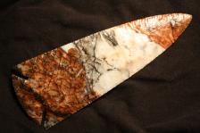 If you want a large spear for a center piece here is your point. This meag spear has brilliant colors and stunning patterns. This massive point has extremely details edging and is striking to look at. It is a collectors point. |