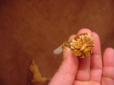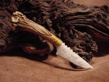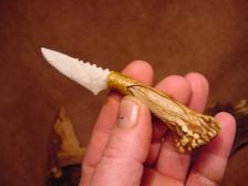 Here is a very beautiful carved Gem stone knife where I carved a "Snow owl" on the end of the antler handle I also carved two white feathers flowing towards the blade, The blade for this knife I knapped from a nice piece of novaculite and serrated a small portion on the top edge, the over all knife has very nice form and is a little sticker for sure. The knife sits up perfectly on display and measures 4"
