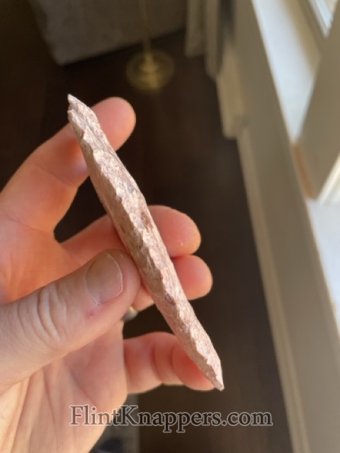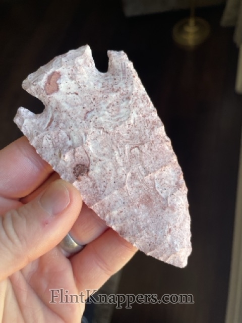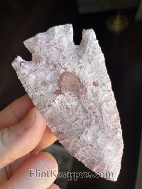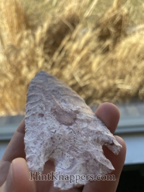 A massive Snyders blade. Burlington chert. This point has sharp edges and nice wide notches characteristic of these blades. Broad percussion scars followed up with fine pressure flaking.
