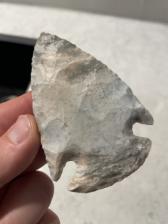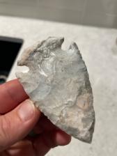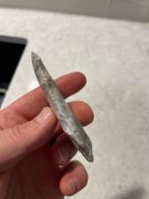 A neatly patterned Midwest Snyders blade. This blade has pinks, greys, blues, and crystal inclusions!