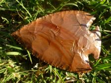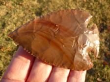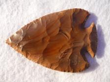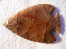 A nice, high gloss Snyders by master flint knapper, Jim Redfearn. It’s chocolate brown and knapped from highly heated Madagascar Jasper. Really nice signature, with a diamond scribe. Knapped Nov, 2002. Signed: Jim Redfearn 11-3-02 |