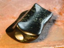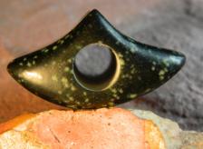 A nice speckled Soapstone Banner. It weighs 3.9 ounces and has a 1/2" hole. This is the type banner I use on my atlatls. They are not fragile and I like the shape, especially the hinged or knobbed type. |