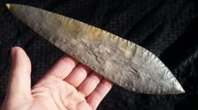 Super thin Solutrean Laurel Leaf style blade made out slightly heat treated Belize Colha chert.
