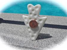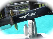 Big, bold, & Impressive! This is a well-made production, Bowie style knife with a stainless steel blade - that I have customized for the collector. the sheath has been dressed-up as well, & the custom stand rounds-out the piece. This big Southwestern slasher is 14 1/4” long. Black wood handle has a soaring eagle inlay, & the blade has a copper Kokopelli onlay. A copper thunderbird & leather lanyard adorn the nylon sheath. I created the stand out of pine wood & textured it with many coats of stone paint. A bone arrowhead with a mini Indian head cent, flew thru the air & stuck perfectly in the center :) Another Kokopelli figure hangs on the knife prop. All-in-all, a very attractive & unique combo! (Big & heavy, - so $12.00 for shipping & insurance). |
