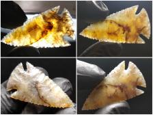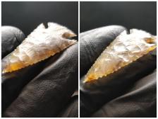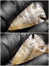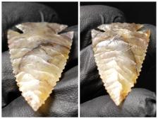 Very nice Corner Notch in an extremely unusual piece of Indian Moss Agate! Awesome colors and Dendrites, and a lot of complex processes visible inside! I've only seen one other cobble like it, and it was too low grade to work. Since this is the first workable piece, I sawed this rounded cobble in half. One half for Flintknappers, and one half for me.