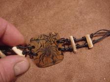 Here is another woolly mammoth scrimshaw I did with a spider and her web , the brown color patina ivory is natural, it is trung with black leather and mammoth spacers,toggle.
