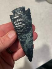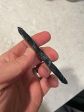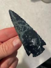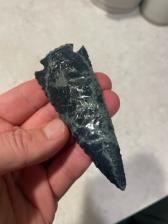 A beautiful Spider-Web Obsidian corner-notch point. The blue “webs” running through this piece of rock make it much more unique than your typical black obsidian.
