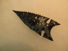 This obsidian point is made out of Mexican 'spider web' obsidian and is done in the style of some desert points I've seen come from Northern Nevada and Warner Valley Oregon. Sweeping needle tip, serrations and deep expanding notches give this 'fox ear' style a deadly look. |