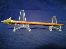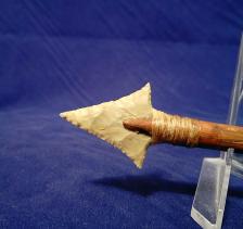 Little stemmed point made from a flake of polychrome jasper, hafted on a dyed Oak shaft with whitetail sinew and animal hide glue |