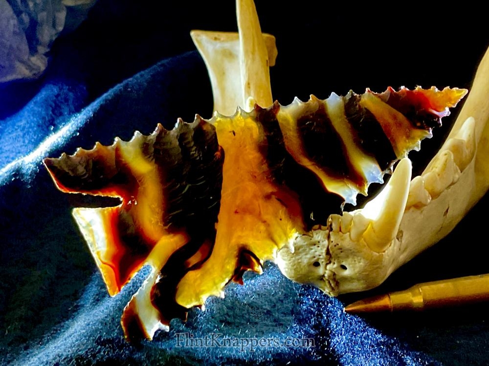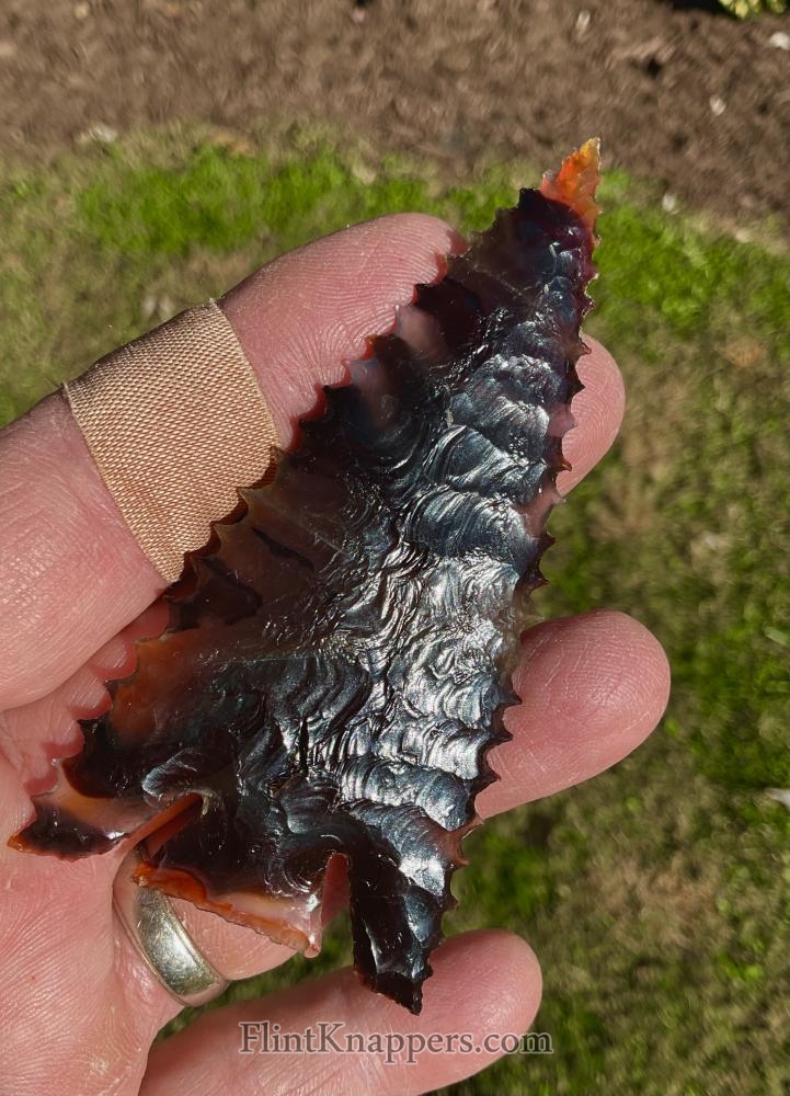 This is a point from my personal collection. I knapped it a few years ago and held on to it. It is one of those incredible pieces of God’s art hidden in volcanic stone years ago. I have often said Piranha Agate holds trapped sunsets. This serrated Pintree has a stormy sky at sunset. It is well made with deep notches and sharp serrations. This is a great point. |
