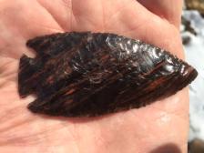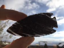 Percussed and then pressure-flaked from eastern Oregon obsidian, this point has thin streaks of red and black in a clear matrix. A nice addition to any collection, or strap it to a stick, or set it on the window sill, just watch those sharp edges!