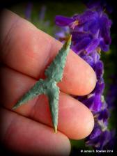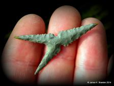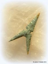 Oregon's Succor Creek Jasper is a wonderful material for points, with its' smooth texture and unique shades of green.  I like to work with it, not only due to its' beauty, but also due to it's ability to hold up to some delicately flaked points.  This side notched arrowhead has the long drawn out ears that my work is known for, and will be a great addition to your collection.