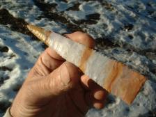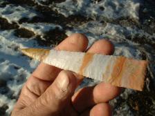 Hi ! A pretty darn good pt.,,good color,very ,thin & even... thank's for stopping by ! It is 5 3/16 x 1 in wide. A new rock for me.Came out great,but slightly tricky to knapp. |