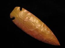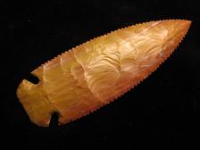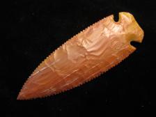 Ok one last listing for the day. I had this all percussion flaked out a day or so ago and I needed to finish it up. Been getting requests for more Dovetails which is a point style I don't normally make but then all the folks back east love 'em, so here's another one with serrations which some of them had. This is made out of a beautiful piece of heat treated sunset jasper and is red on one side and predominantly yellow on the other with longitudinal stripes running through it some of which are semi clear. Its really hard to find sunset jasper this large and percussion flaking it takes some very careful doing. I'm actually temped to keep this one for myself. |