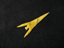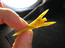 Nice long Gunther point made from Central Oregon Sunset Jasper. Real pretty semi translucent yellow colored jasper. Thin with nice long barbs. |